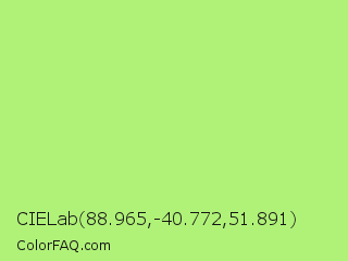 CIELab 88.965,-40.772,51.891 Color is a light green color and the nearest color is Sulu #c1f07c. Hex code #b0f278 and RGB value is rgb(176,242,120). In RGB color space, this color is composed of 69% red, 95% green, 47% blue, In CMYK color space, this color is composed of 27% cyan, 0% magenta, 50% yellow , 5% black , In HSL color space, this color has a hue angle of 92° , 82% saturation and 71% lightness.