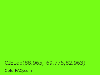 CIELab 88.965,-69.775,82.963 Color is a normal green color and the nearest color is Lawn Green #7cfc00. Hex code #75fd16 and RGB value is rgb(117,253,22). In RGB color space, this color is composed of 46% red, 99% green, 9% blue, In CMYK color space, this color is composed of 54% cyan, 0% magenta, 91% yellow , 1% black , In HSL color space, this color has a hue angle of 95° , 98% saturation and 54% lightness.
