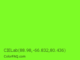 CIELab 88.98,-66.832,80.436 Color is a normal green color and the nearest color is Spring Frost #87ff2a. Hex code #7dfc26 and RGB value is rgb(125,252,38). In RGB color space, this color is composed of 49% red, 99% green, 15% blue, In CMYK color space, this color is composed of 50% cyan, 0% magenta, 85% yellow , 1% black , In HSL color space, this color has a hue angle of 96° , 97% saturation and 57% lightness.