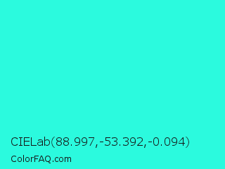 CIELab 88.997,-53.392,-0.094 Color is a normal cyan color and the nearest color is Turquoise #40e0d0. Hex code #2bfade and RGB value is rgb(43,250,222). In RGB color space, this color is composed of 17% red, 98% green, 87% blue, In CMYK color space, this color is composed of 83% cyan, 0% magenta, 11% yellow , 2% black , In HSL color space, this color has a hue angle of 172° , 95% saturation and 57% lightness.