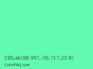 CIELab 88.997,-56.717,23.8 Color is a light green color and the nearest color is Medium Aquamarine #66ddaa. Hex code #63fab0 and RGB value is rgb(99,250,176). In RGB color space, this color is composed of 39% red, 98% green, 69% blue, In CMYK color space, this color is composed of 60% cyan, 0% magenta, 30% yellow , 2% black , In HSL color space, this color has a hue angle of 151° , 94% saturation and 68% lightness.
