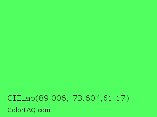 CIELab 89.006,-73.604,61.17 Color is a light green color and the nearest color is Screamin Green #66ff66. Hex code #52ff61 and RGB value is rgb(82,255,97). In RGB color space, this color is composed of 32% red, 100% green, 38% blue, In CMYK color space, this color is composed of 68% cyan, 0% magenta, 62% yellow , 0% black , In HSL color space, this color has a hue angle of 125° , 100% saturation and 66% lightness.