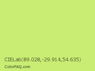 CIELab 89.028,-29.914,54.635 Color is a light lime color and the nearest color is Sulu #c1f07c. Hex code #c9ed73 and RGB value is rgb(201,237,115). In RGB color space, this color is composed of 79% red, 93% green, 45% blue, In CMYK color space, this color is composed of 15% cyan, 0% magenta, 51% yellow , 7% black , In HSL color space, this color has a hue angle of 78° , 77% saturation and 69% lightness.