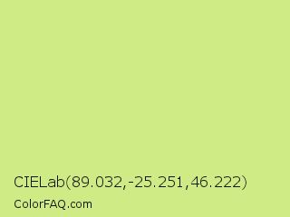 CIELab 89.032,-25.251,46.222 Color is a light lime color and the nearest color is Medium Spring Bud #c9dc87. Hex code #ceeb85 and RGB value is rgb(206,235,133). In RGB color space, this color is composed of 81% red, 92% green, 52% blue, In CMYK color space, this color is composed of 12% cyan, 0% magenta, 43% yellow , 8% black , In HSL color space, this color has a hue angle of 77° , 72% saturation and 72% lightness.