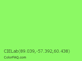 CIELab 89.039,-57.392,60.438 Color is a light green color and the nearest color is Screamin Green #66ff66. Hex code #8cf964 and RGB value is rgb(140,249,100). In RGB color space, this color is composed of 55% red, 98% green, 39% blue, In CMYK color space, this color is composed of 44% cyan, 0% magenta, 60% yellow , 2% black , In HSL color space, this color has a hue angle of 104° , 93% saturation and 68% lightness.