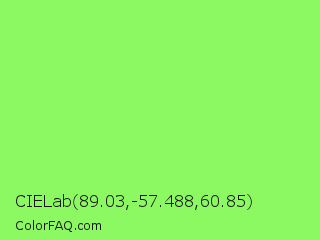 CIELab 89.03,-57.488,60.85 Color is a light green color and the nearest color is Screamin Green #66ff66. Hex code #8cf963 and RGB value is rgb(140,249,99). In RGB color space, this color is composed of 55% red, 98% green, 39% blue, In CMYK color space, this color is composed of 44% cyan, 0% magenta, 60% yellow , 2% black , In HSL color space, this color has a hue angle of 104° , 93% saturation and 68% lightness.