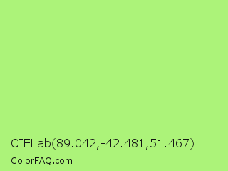 CIELab 89.042,-42.481,51.467 Color is a light green color and the nearest color is Sulu #c1f07c. Hex code #acf379 and RGB value is rgb(172,243,121). In RGB color space, this color is composed of 67% red, 95% green, 47% blue, In CMYK color space, this color is composed of 29% cyan, 0% magenta, 50% yellow , 5% black , In HSL color space, this color has a hue angle of 95° , 84% saturation and 71% lightness.