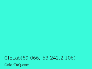 CIELab 89.066,-53.242,2.106 Color is a normal cyan color and the nearest color is Turquoise #40e0d0. Hex code #39fada and RGB value is rgb(57,250,218). In RGB color space, this color is composed of 22% red, 98% green, 85% blue, In CMYK color space, this color is composed of 77% cyan, 0% magenta, 13% yellow , 2% black , In HSL color space, this color has a hue angle of 170° , 95% saturation and 60% lightness.