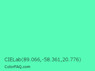 CIELab 89.066,-58.361,20.776 Color is a light green color and the nearest color is Medium Aquamarine #66ddaa. Hex code #55fbb6 and RGB value is rgb(85,251,182). In RGB color space, this color is composed of 33% red, 98% green, 71% blue, In CMYK color space, this color is composed of 66% cyan, 0% magenta, 27% yellow , 2% black , In HSL color space, this color has a hue angle of 155° , 95% saturation and 66% lightness.