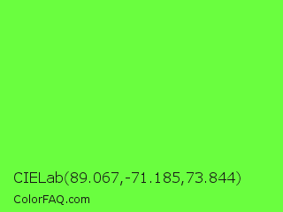 CIELab 89.067,-71.185,73.844 Color is a light green color and the nearest color is Spring Frost #87ff2a. Hex code #6afe3f and RGB value is rgb(106,254,63). In RGB color space, this color is composed of 42% red, 100% green, 25% blue, In CMYK color space, this color is composed of 58% cyan, 0% magenta, 75% yellow , 0% black , In HSL color space, this color has a hue angle of 106° , 99% saturation and 62% lightness.