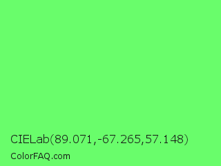 CIELab 89.071,-67.265,57.148 Color is a light green color and the nearest color is Screamin Green #66ff66. Hex code #69fd6b and RGB value is rgb(105,253,107). In RGB color space, this color is composed of 41% red, 99% green, 42% blue, In CMYK color space, this color is composed of 58% cyan, 0% magenta, 58% yellow , 1% black , In HSL color space, this color has a hue angle of 121° , 97% saturation and 70% lightness.