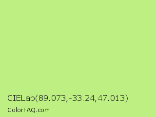 CIELab 89.073,-33.24,47.013 Color is a light green color and the nearest color is Sulu #c1f07c. Hex code #beef83 and RGB value is rgb(190,239,131). In RGB color space, this color is composed of 75% red, 94% green, 51% blue, In CMYK color space, this color is composed of 21% cyan, 0% magenta, 45% yellow , 6% black , In HSL color space, this color has a hue angle of 87° , 77% saturation and 73% lightness.