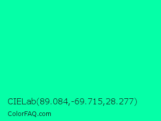 CIELab 89.084,-69.715,28.277 Color is a normal green color and the nearest color is Medium Spring Green #00fa9a. Hex code #05ffa7 and RGB value is rgb(5,255,167). In RGB color space, this color is composed of 2% red, 100% green, 65% blue, In CMYK color space, this color is composed of 98% cyan, 0% magenta, 35% yellow , 0% black , In HSL color space, this color has a hue angle of 159° , 100% saturation and 51% lightness.