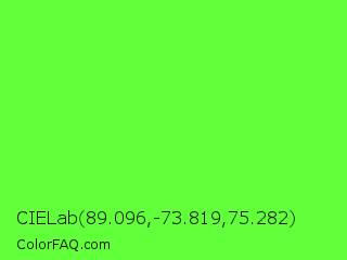CIELab 89.096,-73.819,75.282 Color is a light green color and the nearest color is Spring Frost #87ff2a. Hex code #61ff3a and RGB value is rgb(97,255,58). In RGB color space, this color is composed of 38% red, 100% green, 23% blue, In CMYK color space, this color is composed of 62% cyan, 0% magenta, 77% yellow , 0% black , In HSL color space, this color has a hue angle of 108° , 100% saturation and 61% lightness.