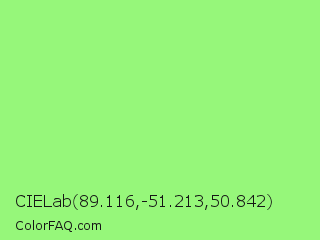 CIELab 89.116,-51.213,50.842 Color is a light green color and the nearest color is Light Green #90ee90. Hex code #96f77a and RGB value is rgb(150,247,122). In RGB color space, this color is composed of 59% red, 97% green, 48% blue, In CMYK color space, this color is composed of 39% cyan, 0% magenta, 51% yellow , 3% black , In HSL color space, this color has a hue angle of 107° , 89% saturation and 72% lightness.