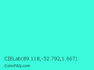 CIELab 89.118,-52.792,1.667 Color is a light cyan color and the nearest color is Turquoise #40e0d0. Hex code #3bfadb and RGB value is rgb(59,250,219). In RGB color space, this color is composed of 23% red, 98% green, 86% blue, In CMYK color space, this color is composed of 76% cyan, 0% magenta, 12% yellow , 2% black , In HSL color space, this color has a hue angle of 170° , 95% saturation and 61% lightness.