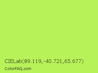 CIELab 89.119,-40.721,65.677 Color is a light green color and the nearest color is Inchworm #b2ec5d. Hex code #b8f259 and RGB value is rgb(184,242,89). In RGB color space, this color is composed of 72% red, 95% green, 35% blue, In CMYK color space, this color is composed of 24% cyan, 0% magenta, 63% yellow , 5% black , In HSL color space, this color has a hue angle of 83° , 85% saturation and 65% lightness.
