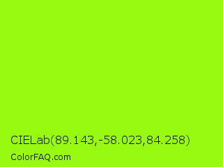 CIELab 89.143,-58.023,84.258 Color is a normal green color and the nearest color is Spring Bud #a7fc00. Hex code #98f911 and RGB value is rgb(152,249,17). In RGB color space, this color is composed of 60% red, 98% green, 7% blue, In CMYK color space, this color is composed of 39% cyan, 0% magenta, 93% yellow , 2% black , In HSL color space, this color has a hue angle of 85° , 95% saturation and 52% lightness.