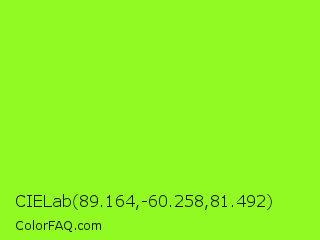 CIELab 89.164,-60.258,81.492 Color is a normal green color and the nearest color is Spring Frost #87ff2a. Hex code #91fa23 and RGB value is rgb(145,250,35). In RGB color space, this color is composed of 57% red, 98% green, 14% blue, In CMYK color space, this color is composed of 42% cyan, 0% magenta, 86% yellow , 2% black , In HSL color space, this color has a hue angle of 89° , 96% saturation and 56% lightness.