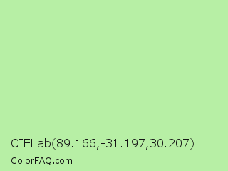 CIELab 89.166,-31.197,30.207 Color is a light green color and the nearest color is Granny Smith Apple #a8e4a0. Hex code #b7efa5 and RGB value is rgb(183,239,165). In RGB color space, this color is composed of 72% red, 94% green, 65% blue, In CMYK color space, this color is composed of 23% cyan, 0% magenta, 31% yellow , 6% black , In HSL color space, this color has a hue angle of 105° , 70% saturation and 79% lightness.
