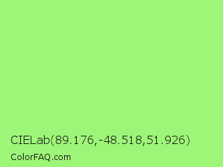 CIELab 89.176,-48.518,51.926 Color is a light green color and the nearest color is Light Green #90ee90. Hex code #9ef678 and RGB value is rgb(158,246,120). In RGB color space, this color is composed of 62% red, 96% green, 47% blue, In CMYK color space, this color is composed of 36% cyan, 0% magenta, 51% yellow , 4% black , In HSL color space, this color has a hue angle of 102° , 88% saturation and 72% lightness.
