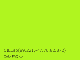 CIELab 89.221,-47.76,82.872 Color is a normal lime color and the nearest color is Green Yellow #adff2f. Hex code #b0f51f and RGB value is rgb(176,245,31). In RGB color space, this color is composed of 69% red, 96% green, 12% blue, In CMYK color space, this color is composed of 28% cyan, 0% magenta, 87% yellow , 4% black , In HSL color space, this color has a hue angle of 79° , 91% saturation and 54% lightness.