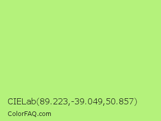 CIELab 89.223,-39.049,50.857 Color is a light green color and the nearest color is Sulu #c1f07c. Hex code #b4f27b and RGB value is rgb(180,242,123). In RGB color space, this color is composed of 71% red, 95% green, 48% blue, In CMYK color space, this color is composed of 26% cyan, 0% magenta, 49% yellow , 5% black , In HSL color space, this color has a hue angle of 91° , 82% saturation and 72% lightness.