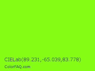 CIELab 89.231,-65.039,83.778 Color is a normal green color and the nearest color is Chartreuse #7fff00. Hex code #85fc13 and RGB value is rgb(133,252,19). In RGB color space, this color is composed of 52% red, 99% green, 7% blue, In CMYK color space, this color is composed of 47% cyan, 0% magenta, 92% yellow , 1% black , In HSL color space, this color has a hue angle of 91° , 97% saturation and 53% lightness.