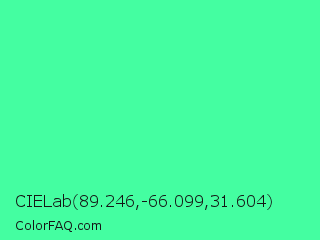 CIELab 89.246,-66.099,31.604 Color is a light green color and the nearest color is Eucalyptus #44d7a8. Hex code #44fea1 and RGB value is rgb(68,254,161). In RGB color space, this color is composed of 27% red, 100% green, 63% blue, In CMYK color space, this color is composed of 73% cyan, 0% magenta, 37% yellow , 0% black , In HSL color space, this color has a hue angle of 150° , 99% saturation and 63% lightness.