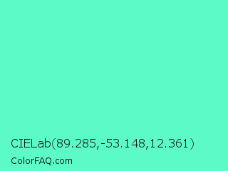 CIELab 89.285,-53.148,12.361 Color is a light green color and the nearest color is Aquamarine #7fffd4. Hex code #5cfac7 and RGB value is rgb(92,250,199). In RGB color space, this color is composed of 36% red, 98% green, 78% blue, In CMYK color space, this color is composed of 63% cyan, 0% magenta, 20% yellow , 2% black , In HSL color space, this color has a hue angle of 161° , 94% saturation and 67% lightness.