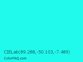 CIELab 89.288,-50.103,-7.489 Color is a normal cyan color and the nearest color is Loeen #15f2fd. Hex code #1ffaed and RGB value is rgb(31,250,237). In RGB color space, this color is composed of 12% red, 98% green, 93% blue, In CMYK color space, this color is composed of 88% cyan, 0% magenta, 5% yellow , 2% black , In HSL color space, this color has a hue angle of 176° , 96% saturation and 55% lightness.
