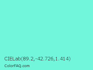 CIELab 89.2,-42.726,1.414 Color is a light cyan color and the nearest color is Aquamarine #7fffd4. Hex code #71f6dc and RGB value is rgb(113,246,220). In RGB color space, this color is composed of 44% red, 96% green, 86% blue, In CMYK color space, this color is composed of 54% cyan, 0% magenta, 11% yellow , 4% black , In HSL color space, this color has a hue angle of 168° , 88% saturation and 70% lightness.