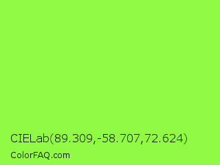 CIELab 89.309,-58.707,72.624 Color is a light green color and the nearest color is French Lime #9efd38. Hex code #91fa45 and RGB value is rgb(145,250,69). In RGB color space, this color is composed of 57% red, 98% green, 27% blue, In CMYK color space, this color is composed of 42% cyan, 0% magenta, 72% yellow , 2% black , In HSL color space, this color has a hue angle of 95° , 95% saturation and 63% lightness.
