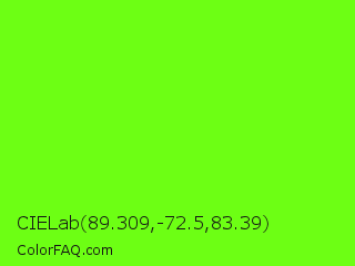 CIELab 89.309,-72.5,83.39 Color is a normal green color and the nearest color is Bright Green #66ff00. Hex code #6dff14 and RGB value is rgb(109,255,20). In RGB color space, this color is composed of 43% red, 100% green, 8% blue, In CMYK color space, this color is composed of 57% cyan, 0% magenta, 92% yellow , 0% black , In HSL color space, this color has a hue angle of 97° , 100% saturation and 54% lightness.