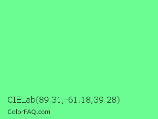 CIELab 89.31,-61.18,39.28 Color is a light green color and the nearest color is Very Light Malachite Green #64e986. Hex code #6bfc92 and RGB value is rgb(107,252,146). In RGB color space, this color is composed of 42% red, 99% green, 57% blue, In CMYK color space, this color is composed of 58% cyan, 0% magenta, 42% yellow , 1% black , In HSL color space, this color has a hue angle of 136° , 96% saturation and 70% lightness.