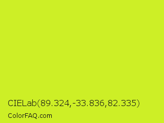 CIELab 89.324,-33.836,82.335 Color is a normal yellow color and the nearest color is Pear #d1e231. Hex code #cdef26 and RGB value is rgb(205,239,38). In RGB color space, this color is composed of 80% red, 94% green, 15% blue, In CMYK color space, this color is composed of 14% cyan, 0% magenta, 84% yellow , 6% black , In HSL color space, this color has a hue angle of 70° , 86% saturation and 54% lightness.