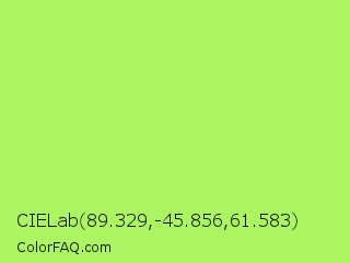 CIELab 89.329,-45.856,61.583 Color is a light green color and the nearest color is Inchworm #b2ec5d. Hex code #abf563 and RGB value is rgb(171,245,99). In RGB color space, this color is composed of 67% red, 96% green, 39% blue, In CMYK color space, this color is composed of 30% cyan, 0% magenta, 60% yellow , 4% black , In HSL color space, this color has a hue angle of 90° , 88% saturation and 67% lightness.