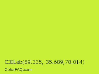 CIELab 89.335,-35.689,78.014 Color is a normal lime color and the nearest color is Pear #d1e231. Hex code #c8f037 and RGB value is rgb(200,240,55). In RGB color space, this color is composed of 78% red, 94% green, 22% blue, In CMYK color space, this color is composed of 17% cyan, 0% magenta, 77% yellow , 6% black , In HSL color space, this color has a hue angle of 73° , 86% saturation and 58% lightness.