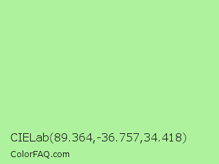 CIELab 89.364,-36.757,34.418 Color is a light green color and the nearest color is Granny Smith Apple #a8e4a0. Hex code #aef29d and RGB value is rgb(174,242,157). In RGB color space, this color is composed of 68% red, 95% green, 62% blue, In CMYK color space, this color is composed of 28% cyan, 0% magenta, 35% yellow , 5% black , In HSL color space, this color has a hue angle of 108° , 77% saturation and 78% lightness.
