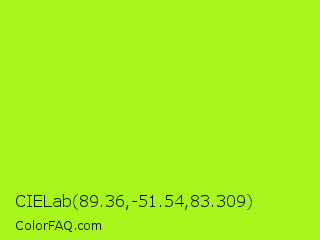 CIELab 89.36,-51.54,83.309 Color is a normal green color and the nearest color is Green Yellow #adff2f. Hex code #a8f71c and RGB value is rgb(168,247,28). In RGB color space, this color is composed of 66% red, 97% green, 11% blue, In CMYK color space, this color is composed of 32% cyan, 0% magenta, 89% yellow , 3% black , In HSL color space, this color has a hue angle of 82° , 93% saturation and 54% lightness.