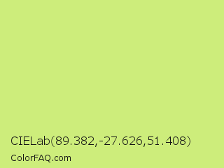 CIELab 89.382,-27.626,51.408 Color is a light lime color and the nearest color is Sulu #c1f07c. Hex code #cded7b and RGB value is rgb(205,237,123). In RGB color space, this color is composed of 80% red, 93% green, 48% blue, In CMYK color space, this color is composed of 14% cyan, 0% magenta, 48% yellow , 7% black , In HSL color space, this color has a hue angle of 77° , 76% saturation and 71% lightness.