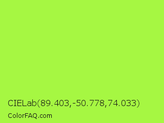 CIELab 89.403,-50.778,74.033 Color is a light green color and the nearest color is French Lime #9efd38. Hex code #a6f742 and RGB value is rgb(166,247,66). In RGB color space, this color is composed of 65% red, 97% green, 26% blue, In CMYK color space, this color is composed of 33% cyan, 0% magenta, 73% yellow , 3% black , In HSL color space, this color has a hue angle of 87° , 92% saturation and 61% lightness.