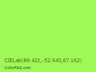 CIELab 89.421,-52.645,67.162 Color is a light green color and the nearest color is Inchworm #b2ec5d. Hex code #9ef855 and RGB value is rgb(158,248,85). In RGB color space, this color is composed of 62% red, 97% green, 33% blue, In CMYK color space, this color is composed of 36% cyan, 0% magenta, 66% yellow , 3% black , In HSL color space, this color has a hue angle of 93° , 92% saturation and 65% lightness.