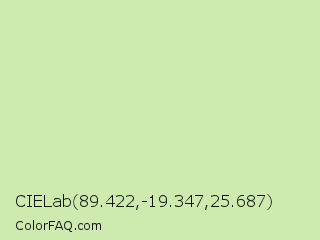 CIELab 89.422,-19.347,25.687 Color is a light green color and the nearest color is Gossip #d2f8b0. Hex code #ceeaaf and RGB value is rgb(206,234,175). In RGB color space, this color is composed of 81% red, 92% green, 69% blue, In CMYK color space, this color is composed of 12% cyan, 0% magenta, 25% yellow , 8% black , In HSL color space, this color has a hue angle of 88° , 58% saturation and 80% lightness.