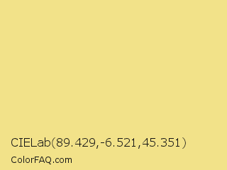 CIELab 89.429,-6.521,45.351 Color is a light yellow color and the nearest color is Sahara Sand #f1e788. Hex code #f2e289 and RGB value is rgb(242,226,137). In RGB color space, this color is composed of 95% red, 89% green, 54% blue, In CMYK color space, this color is composed of 0% cyan, 7% magenta, 43% yellow , 5% black , In HSL color space, this color has a hue angle of 51° , 80% saturation and 74% lightness.