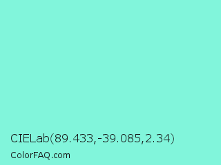 CIELab 89.433,-39.085,2.34 Color is a light cyan color and the nearest color is Aquamarine #7fffd4. Hex code #81f5db and RGB value is rgb(129,245,219). In RGB color space, this color is composed of 51% red, 96% green, 86% blue, In CMYK color space, this color is composed of 47% cyan, 0% magenta, 11% yellow , 4% black , In HSL color space, this color has a hue angle of 167° , 85% saturation and 73% lightness.