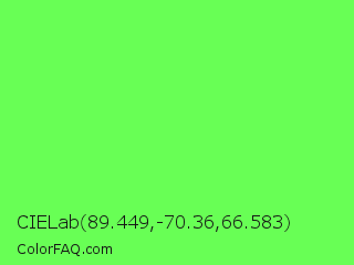 CIELab 89.449,-70.36,66.583 Color is a light green color and the nearest color is Screamin Green #66ff66. Hex code #68ff55 and RGB value is rgb(104,255,85). In RGB color space, this color is composed of 41% red, 100% green, 33% blue, In CMYK color space, this color is composed of 59% cyan, 0% magenta, 67% yellow , 0% black , In HSL color space, this color has a hue angle of 113° , 100% saturation and 67% lightness.
