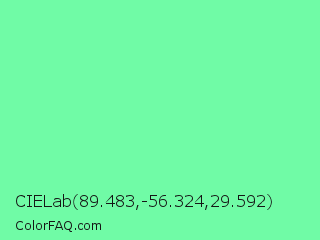 CIELab 89.483,-56.324,29.592 Color is a light green color and the nearest color is Medium Aquamarine #66ddaa. Hex code #70fba6 and RGB value is rgb(112,251,166). In RGB color space, this color is composed of 44% red, 98% green, 65% blue, In CMYK color space, this color is composed of 55% cyan, 0% magenta, 34% yellow , 2% black , In HSL color space, this color has a hue angle of 143° , 95% saturation and 71% lightness.