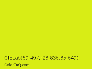 CIELab 89.497,-28.836,85.649 Color is a normal yellow color and the nearest color is Piss Yellow #e1e115. Hex code #d8ed15 and RGB value is rgb(216,237,21). In RGB color space, this color is composed of 85% red, 93% green, 8% blue, In CMYK color space, this color is composed of 9% cyan, 0% magenta, 91% yellow , 7% black , In HSL color space, this color has a hue angle of 66° , 86% saturation and 51% lightness.