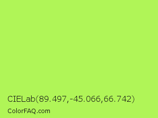CIELab 89.497,-45.066,66.742 Color is a light green color and the nearest color is Inchworm #b2ec5d. Hex code #b0f557 and RGB value is rgb(176,245,87). In RGB color space, this color is composed of 69% red, 96% green, 34% blue, In CMYK color space, this color is composed of 28% cyan, 0% magenta, 64% yellow , 4% black , In HSL color space, this color has a hue angle of 86° , 89% saturation and 65% lightness.